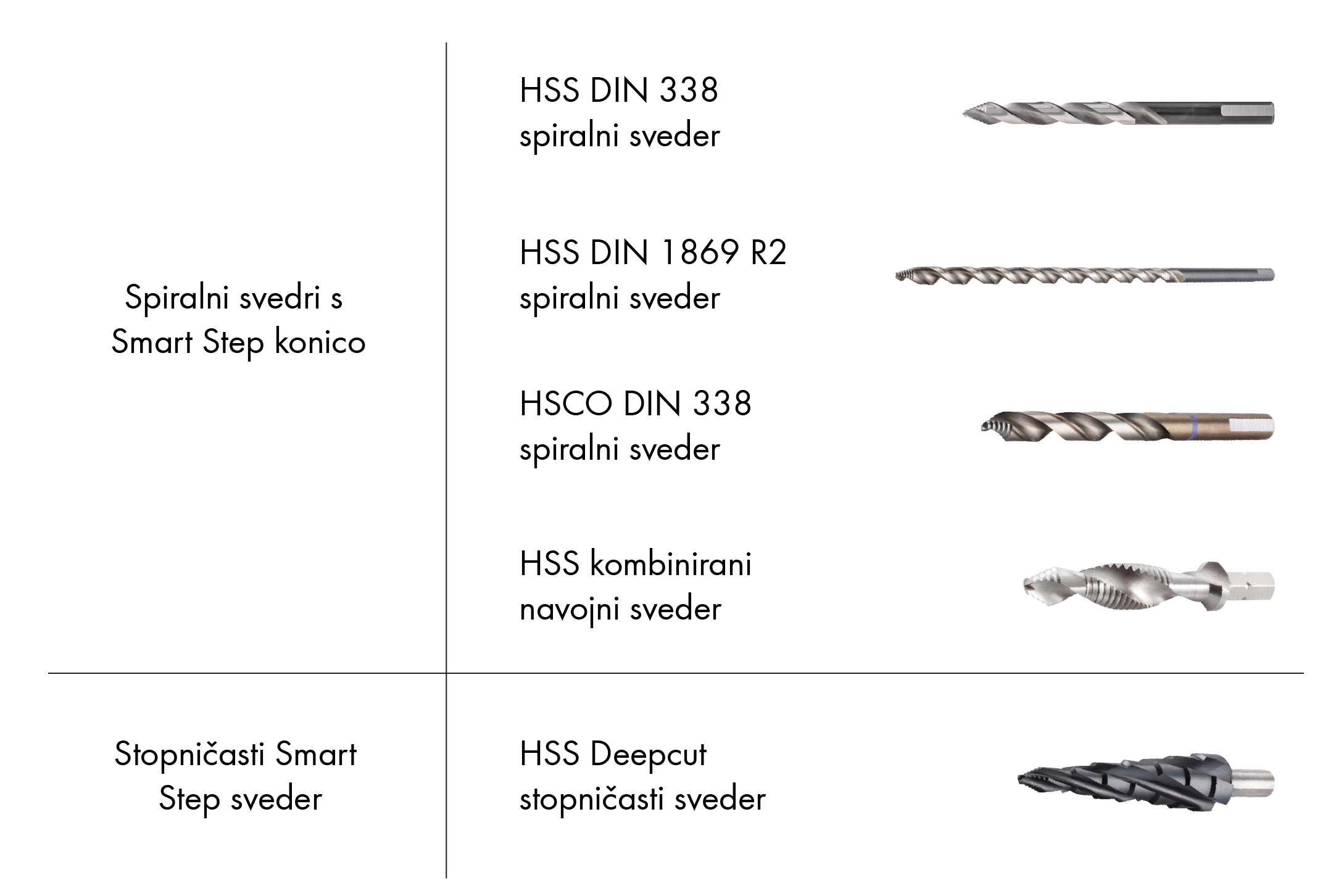 Znotraj linije Smart Step svedrov se nahaja 5 različnih tipov svedrov, med katerimi so spiralni in stopničasti.